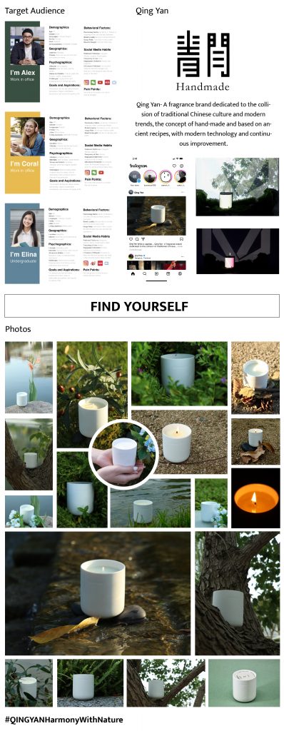 This project revolves around the fragrance brand Qingyan, a cutting-edge brand dedicated to integrating traditional Chinese culture with modern trends. We focus on its scented candle series for social media visual design. The product itself is round and pure white, and the minimalist style provides a broad space for creation, but it also poses the challenge of how to express the brand’s temperament in simplicity. During the design process, we drew inspiration from the natural, harmonious and calm tonality conveyed by Qingyan, and around three fragrance types: earth scent, floral scent and woody scent, we extracted three natural images of flowers, earth and water, and constructed the main line of visual narrative. The final presentation includes product photography still life pictures, promotional videos, GIF animations and other forms, aiming to convey the sensory experience and brand philosophy behind the fragrance.