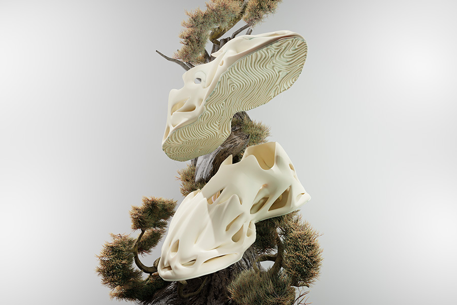 The design of these shoes is inspired by the eight trigrams and the five elements in traditional Chinese culture, especially the “wood” in the five elements and the “Xun Gua” in the eight trigrams. The Xun Gua symbolizes external rigidity and internal flexibility, just like the toughness and softness of the plant cell structure. We explored the structure of plant cells and used parametric design techniques to incorporate their unique geometry and flexibility into the appearance and structure of the shoe.