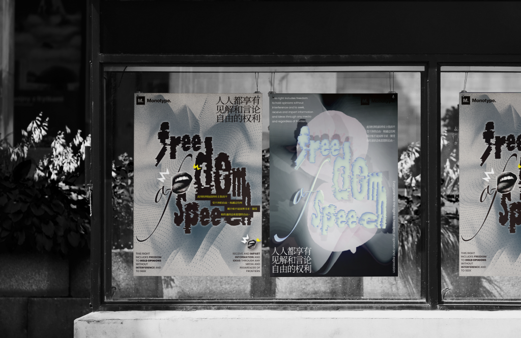 Graphic design for freedom of expression in the Universal Declaration of Human Rights, including dynamic video and promotional posters.