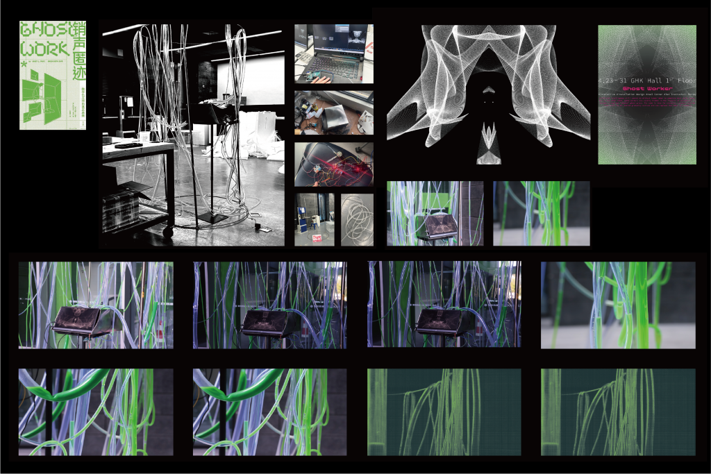 Using the concept of “Ghost Worker, from the communication sciences, the green color indicates that these workers can be eliminated. We create a circular installation to show the unequal relationship between humans and Al